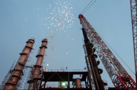 此次吊裝采用1000噸履帶吊,吊裝設(shè)備重達(dá)478噸、長達(dá)65米,吊裝作業(yè)環(huán)境狹窄;再加上吊裝前幾日連續(xù)大雨造成的嚴(yán)重積水,使得此次吊裝工作面臨巨大的難題。在項目部起重負(fù)責(zé)人劉繼蓀的協(xié)調(diào)指揮下,吊裝工作經(jīng)歷了4個半小時的奮戰(zhàn)后,終于成功安裝就位。這標(biāo)志著兗礦新疆煤化工有限公司整個工程最大的合成塔在經(jīng)歷了四個月的艱苦努力后順利安裝成功。同時也標(biāo)志著我項目的大件設(shè)備吊裝進(jìn)入掃尾階段,安裝工程開始逐步向單體試車邁入。
