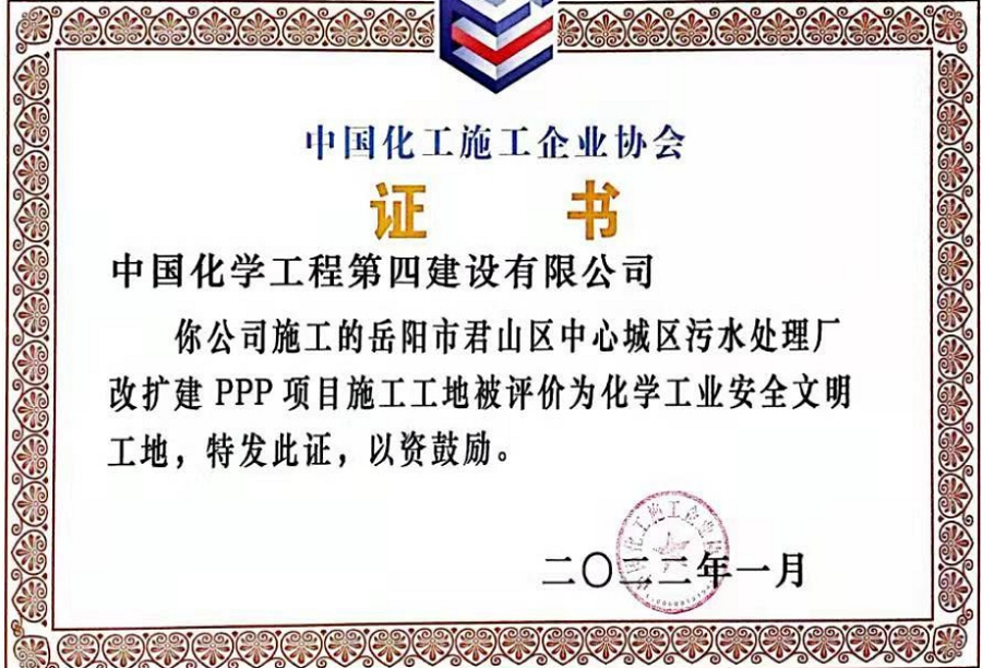近日,從中國化工施工企業(yè)協(xié)會傳來喜訊,由市政工程公司承建的岳陽市君山區(qū)中心城區(qū)污水處理廠改擴建PPP項目被評為“化學工業(yè)安全文明工地”稱號。