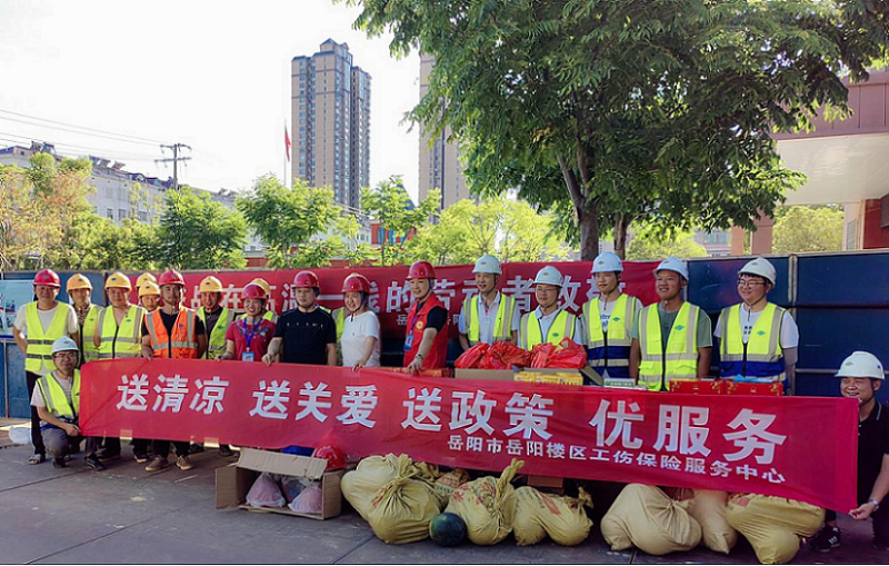 近日,岳陽(yáng)樓區(qū)人社局副局長(zhǎng)彭可軍、工傷保險(xiǎn)服務(wù)中心主任李平平一行來(lái)到市政工程公司岳陽(yáng)市政府地塊雨污分流改造工程朝陽(yáng)小學(xué)片區(qū)現(xiàn)場(chǎng),開(kāi)展“送清涼、送關(guān)愛(ài)、送政策”活動(dòng),為工友們送來(lái)清涼飲料、云南白藥氣霧劑、藿香正氣水等一系列降溫防暑物品,并耐心講解工傷保險(xiǎn)業(yè)務(wù)辦理流程等相關(guān)政策規(guī)定。同時(shí),叮囑大家做好防暑降溫工作,避開(kāi)高溫作業(yè),保障自身安全也保障工程質(zhì)量。