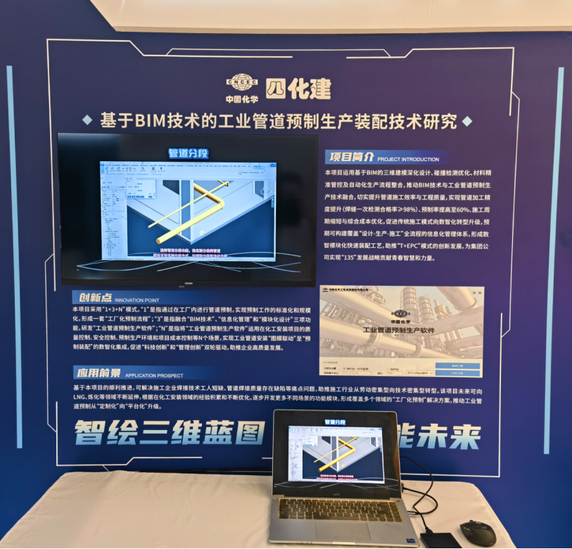會議期間,舉行了中國化學(xué)首屆青年創(chuàng)新創(chuàng)效展,公司青年創(chuàng)新創(chuàng)效項目——基于BIM技術(shù)的工業(yè)管道預(yù)制生產(chǎn)裝配技術(shù)研究項目亮相展會,通過視頻、圖文及展板講解等多種形式,全方位展示了項目成果。該項目通過“1+3+N”模式推動施工數(shù)字化轉(zhuǎn)型,預(yù)制率提升至60%,為傳統(tǒng)施工模式注入數(shù)智化動力。